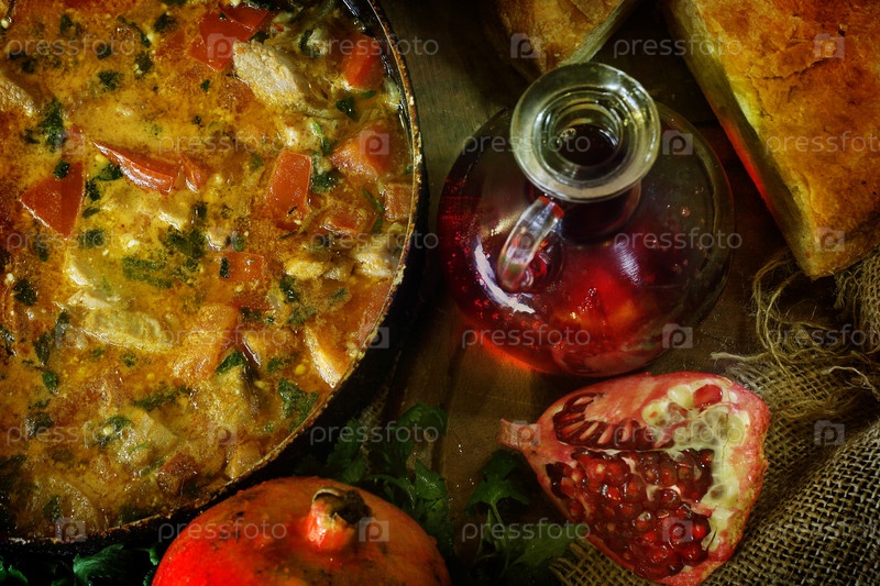 Мясо, тушеное с томатом и луком в сковороде с гранатом и хачапури и вином на деревянном столе