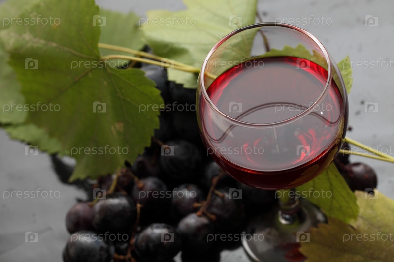 Натюрморт с бокалом красного вина, виноград на черном фоне