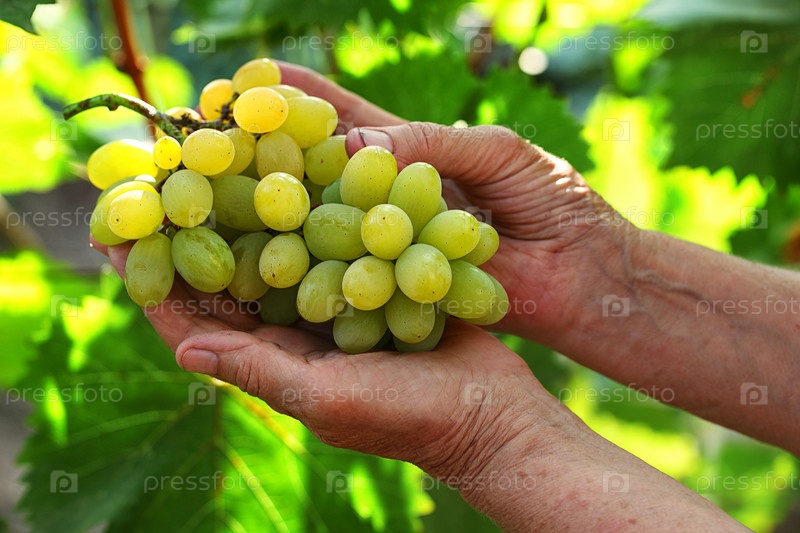 Фермер держит в руках гроздь белого винограда на фоне виноградника