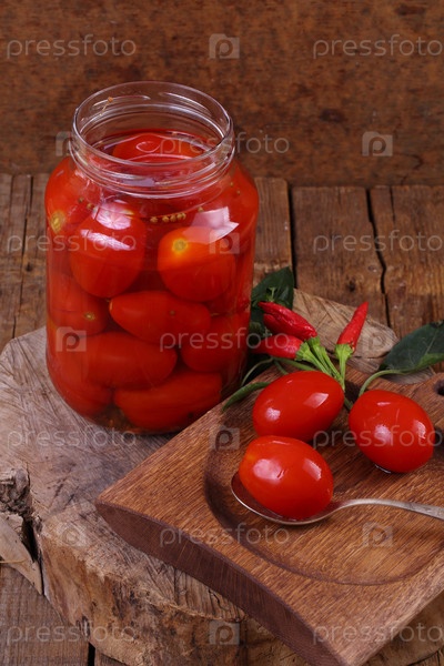 Баллон с солеными красными помидорами на деревянном фоне