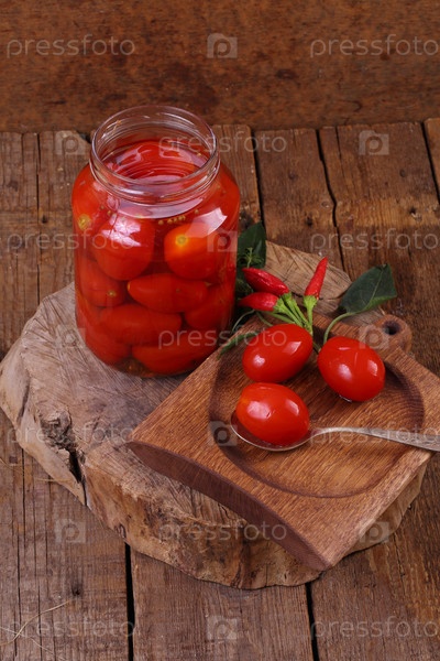 Баллон с солеными красными помидорами на деревянном фоне