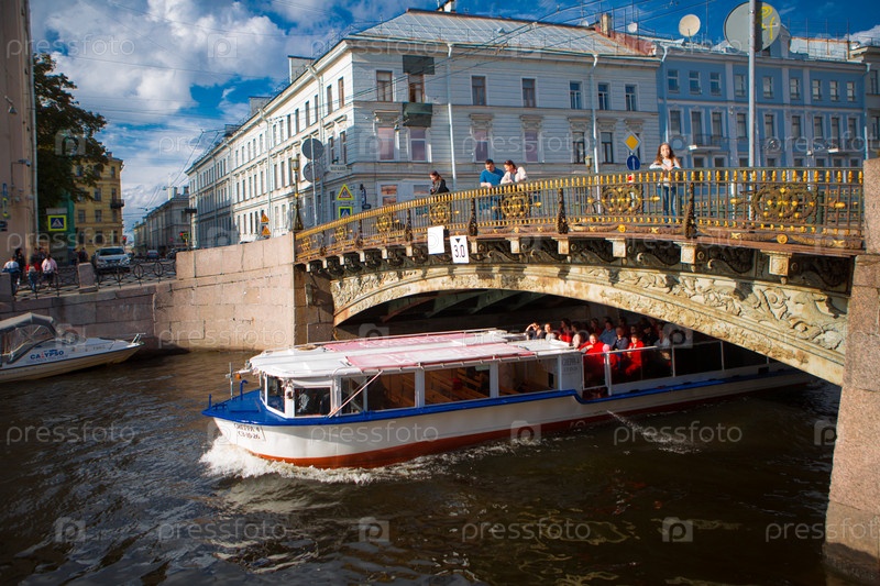 Санкт-Петербург. Экскурсионный катер идет по каналу в солнечный день