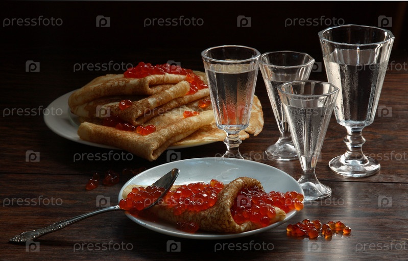 Блины с икрой и водкой на деревянном столе