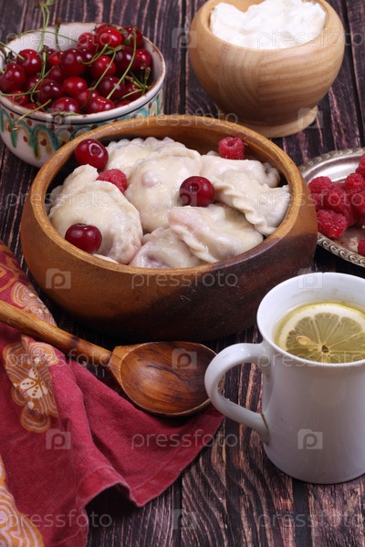 Домашние вареники с вишней, малиной и чаем с лимоном на деревянном фоне