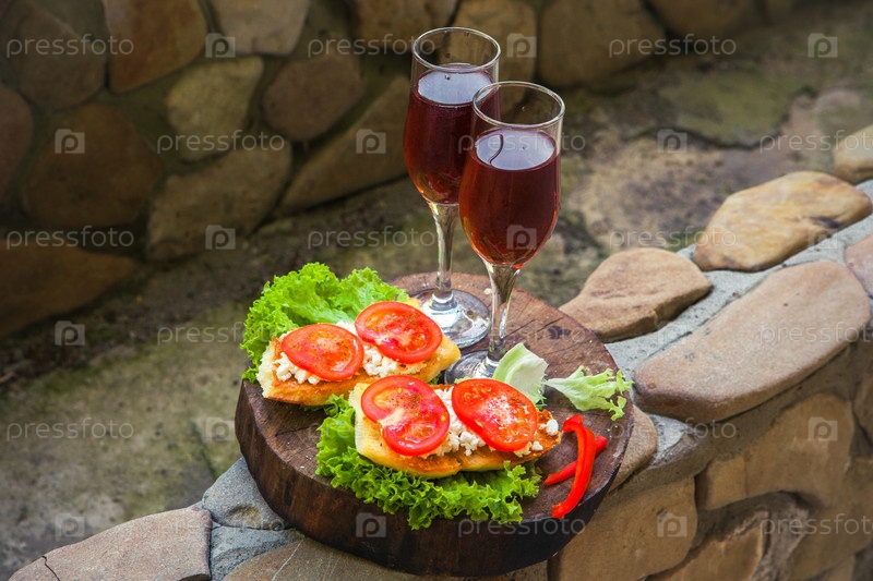 Закуска брускетта с красным вином на деревянном столе