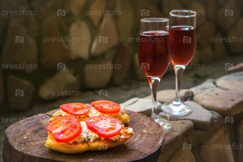 Закуска брускетта с красным вином на деревянном столе