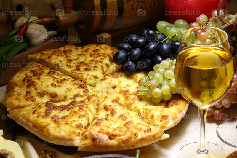 Хачапури по-мегрельски с виноград и белое вино на деревянном столе