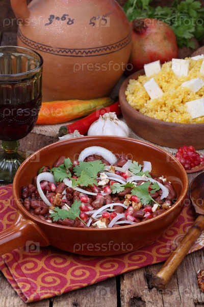 Лобио с кукурузной кашей, сыром, хачапури и ткемали