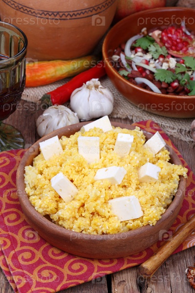 Кукурузная каша в керамической тарелке на деревянном фоне