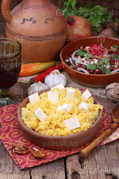 Кукурузная каша в керамической тарелке на деревянном фоне