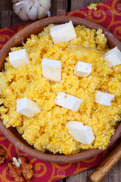 Кукурузная каша в керамической тарелке на деревянном фоне