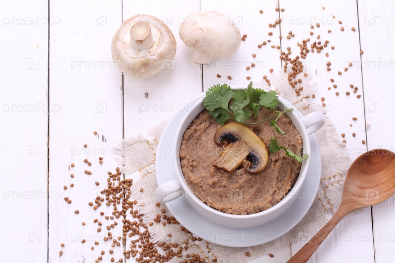 Гречневая каша с грибами на белом,деревянном фоне