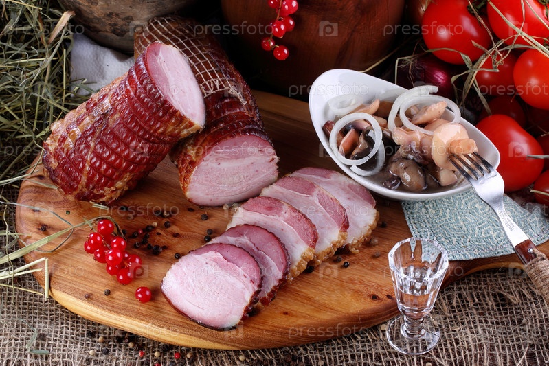 Натюрморт с беконом и водкой на деревянном столе