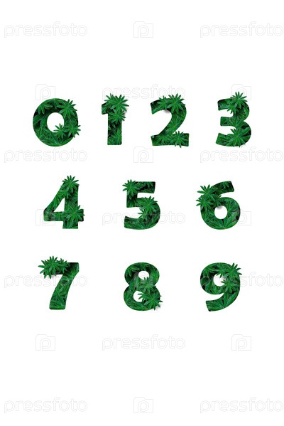 Арабские цифры от нуля до девяти, выделенные на белом фоне. Стилизован под коллаж из фотографии листа цветка люпина