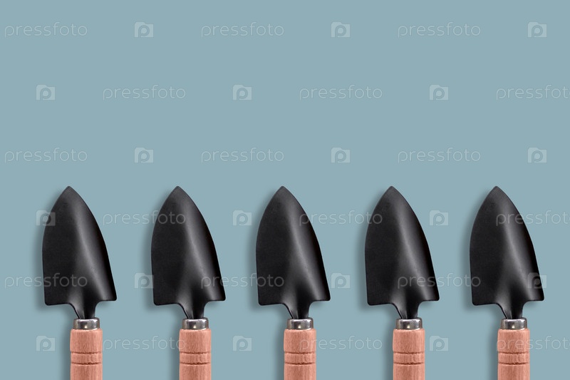 Композиция из маленьких садовых лопаток, расположенных в ряд внизу на зелено-голубом фоне. Место для текста