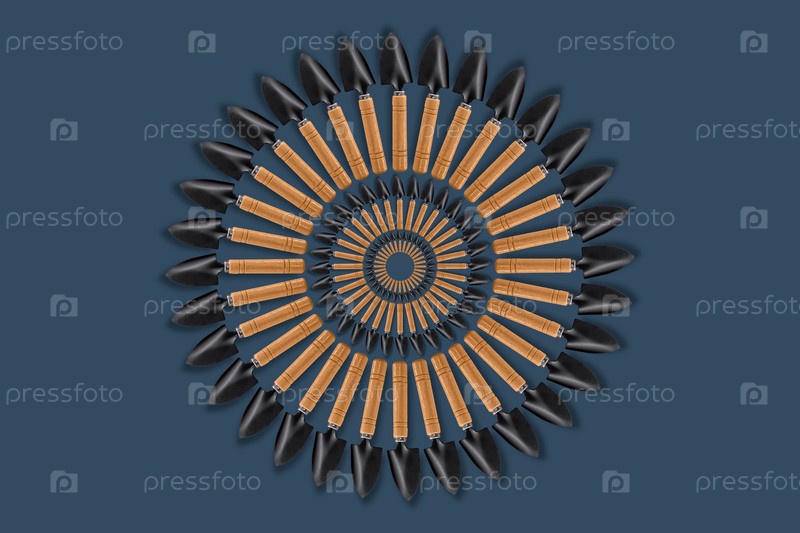 Композиция из маленьких садовых лопат, собранных по кругу на синем фоне, место для текста