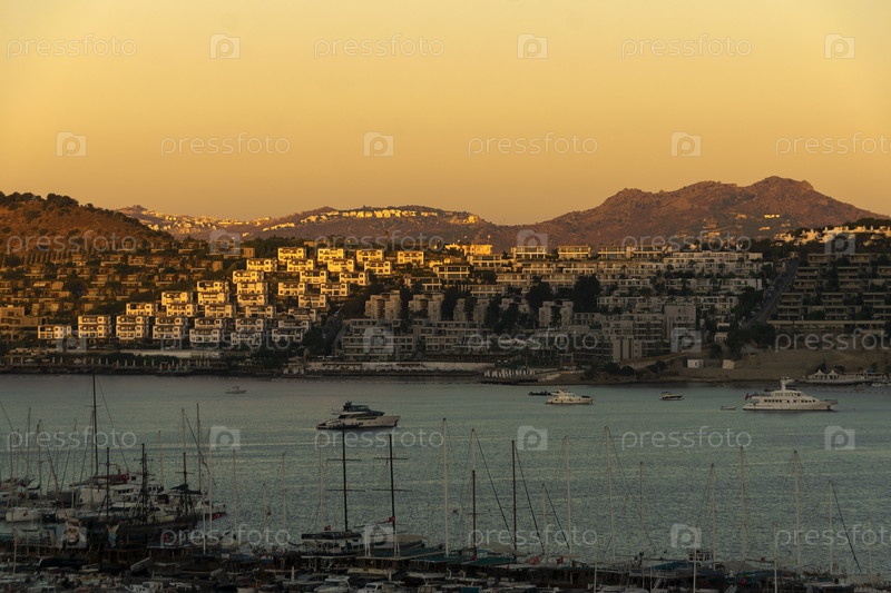 Красивый утренний пейзаж с восходом солнца в заливе Гумбет города Бодрум