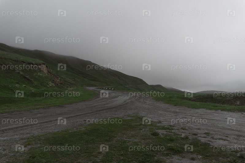 Дорога в горах в тумане. Пейзаж Северного Кавказа