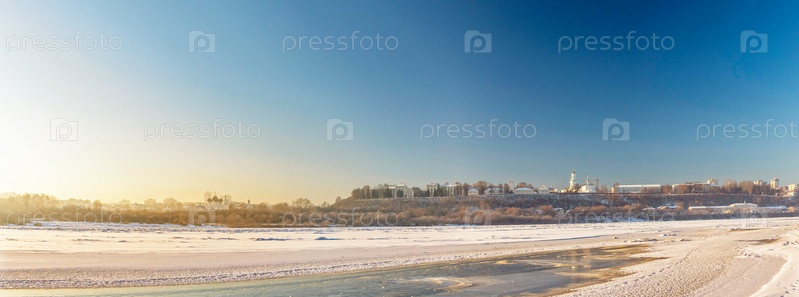 Панорама замерзшей реки и города в холодный зимний день