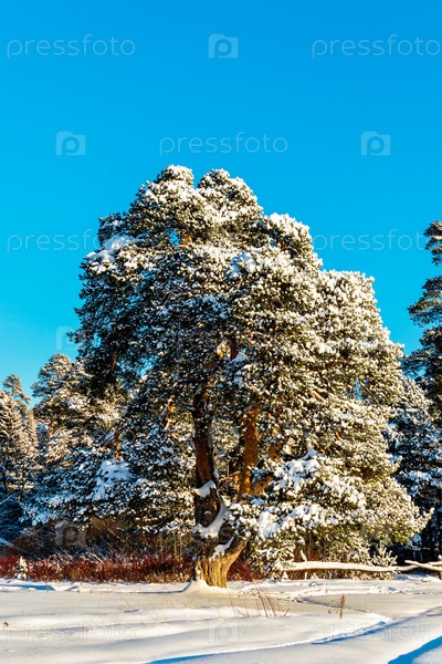Сосна в морозный и солнечный зимний день