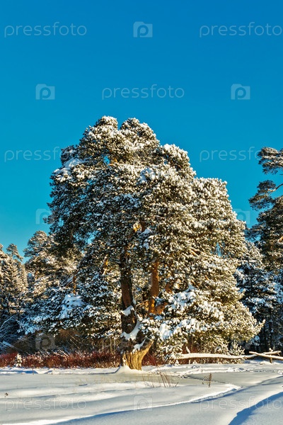 Сосна в морозный и солнечный зимний день