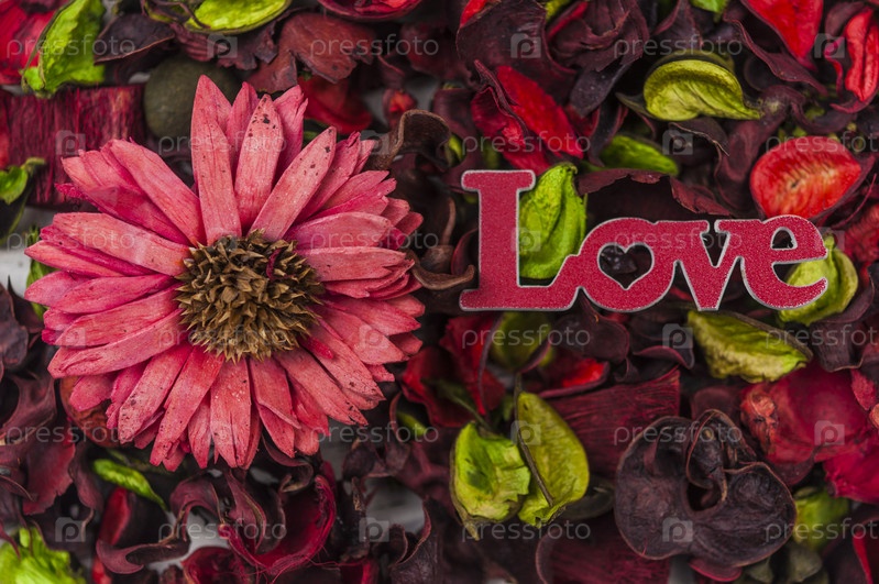 Деревенский и гранж-фон природы. Сушеные красочные лепестки, разбросанные по белому деревянному фону со словом ЛЮБОВЬ
