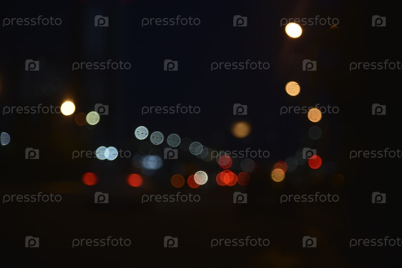 Разноцветные отражения фонарей на вечерней дороге вечером. Блюр и боке от вечернего города