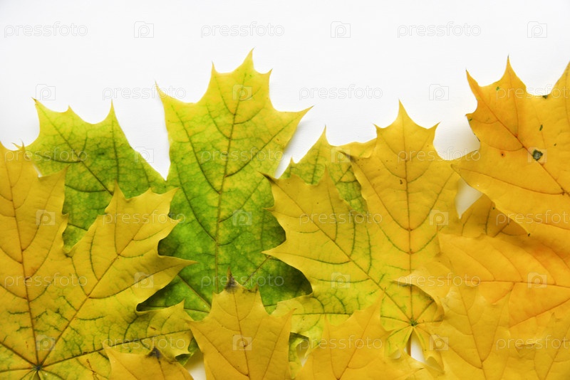 Желтые и зеленые кленовые листья и белый фон сверху. Красивые кленовые цветы и белый фон