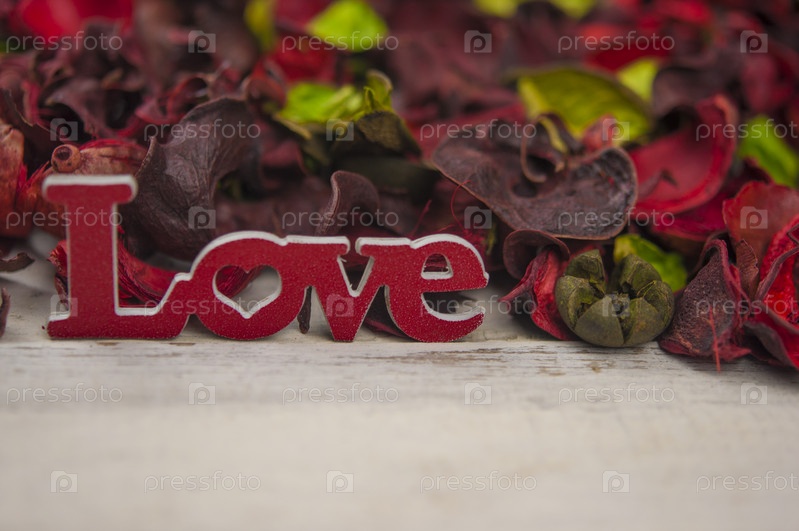 Деревенский и гранж-фон природы. Сушеные красочные лепестки, разбросанные по белому деревянному фону со словом ЛЮБОВЬ