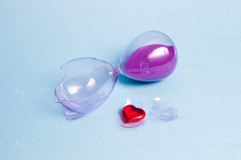 Разбитые стеклянные песочные часы и красное сердце на синем фоне