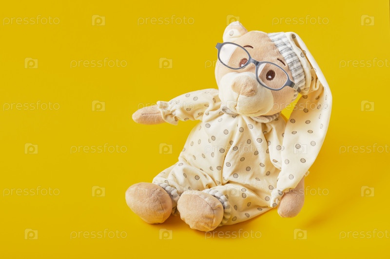 Милый плюшевый мишка в очках на желтом фоне, трендовый цвет