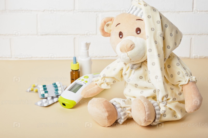 Милый плюшевый мишка, лекарства и бесконтактный инфракрасный термометр на фоне стены из белого кирпича