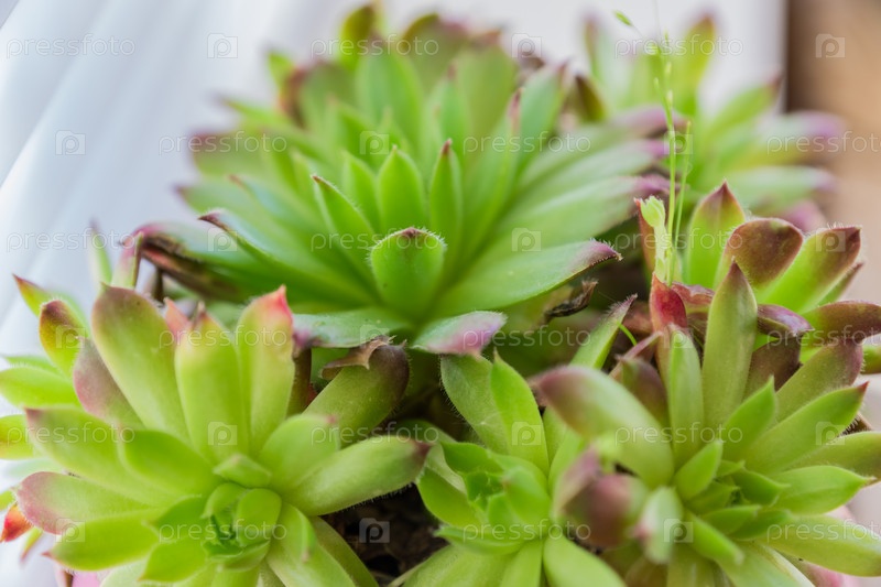 Большой план суккулентного домашнего лука Sempervivum в горшке