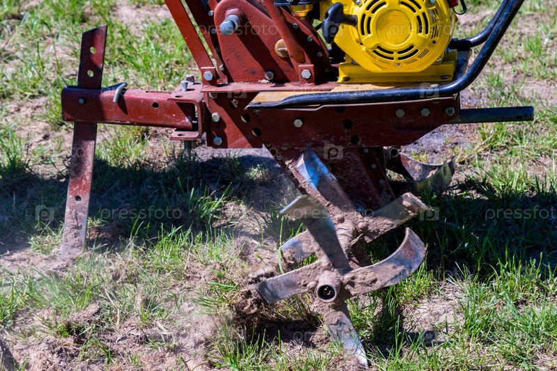 Крупный план небольшого ручного трактора (мотоблока) для вспашки поля