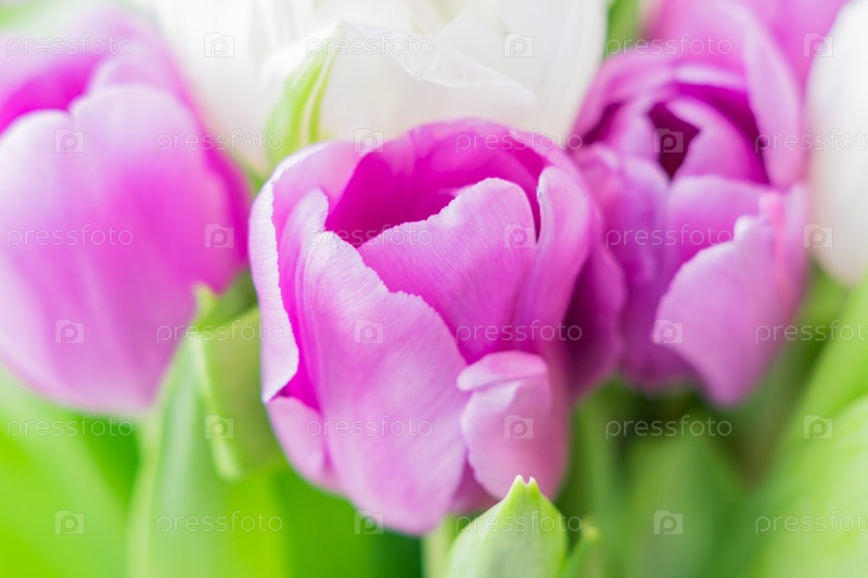 Белые и фиолетовые цветущие тюльпаны. цветочный фон