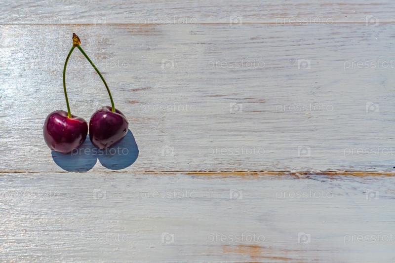 Синяя тарелка спелой черешни на белом деревянном столе