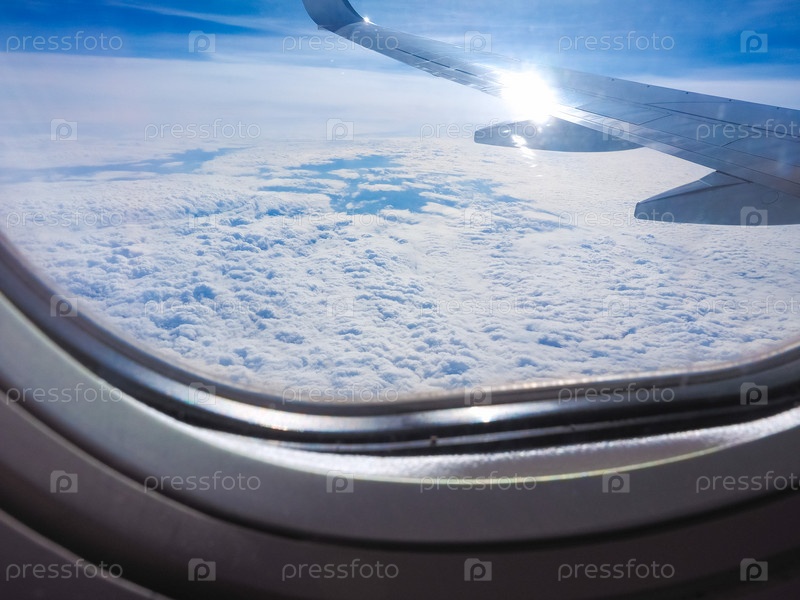 Голубое небо с облаками видно из окна самолета