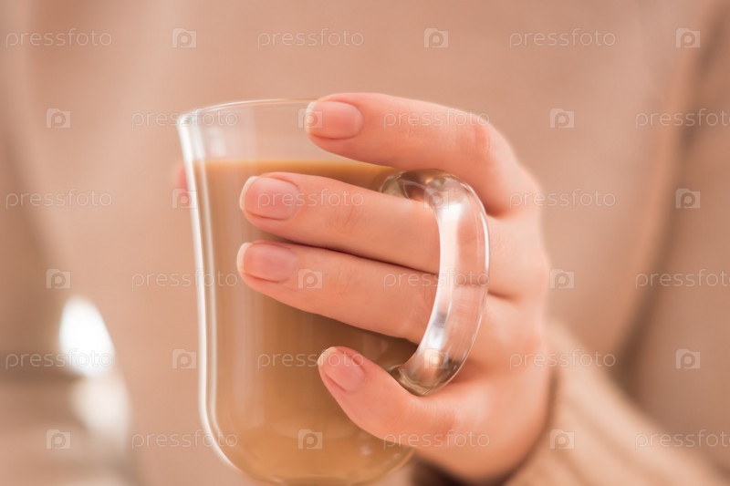 Горячий кофе с молоком в прозрачном стакане в женских руках, на бежевом фоне