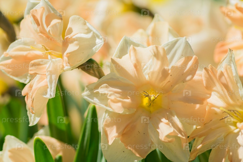 Нежные цветущие нарциссы персикового цвета в весеннем саду