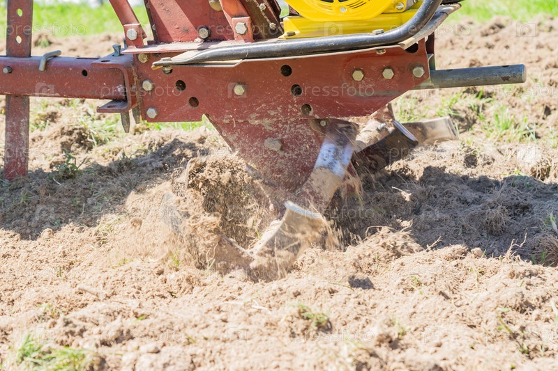 Крупный план небольшого ручного трактора (мотоблока) для вспашки поля