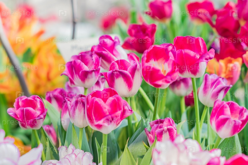 Поле цветущих разноцветных тюльпанов, весенние цветы в саду