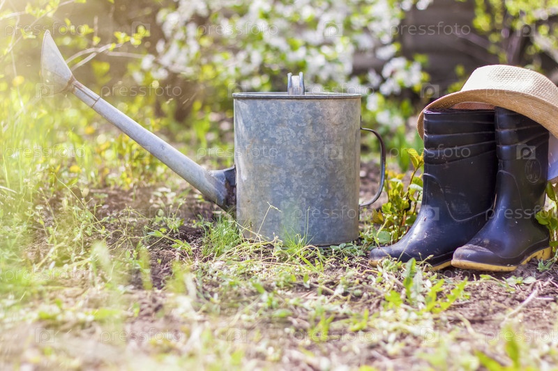 В саду стоят старая железная лейка, шапка и резиновые сапоги. Садоводство и садоводство,
