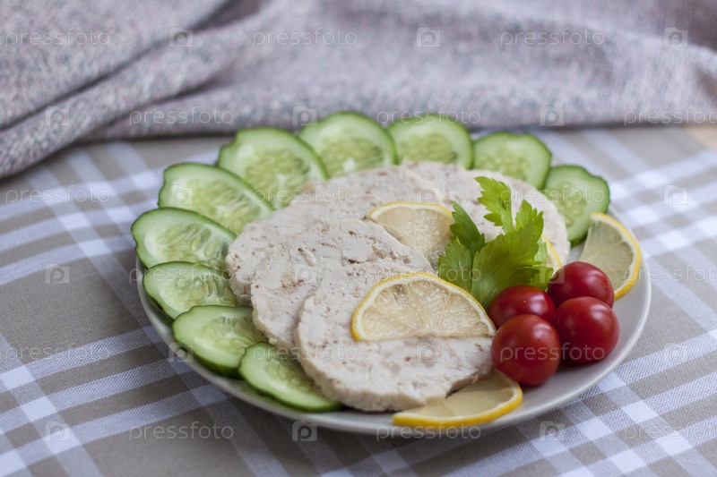 Мясо запеченной курицы нарезать ломтиками. Ломтики запеченного куриного мяса выкладываются на тарелку вместе с огурцом и помидорами черри