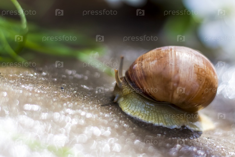 Крупные белые улитки-моллюски с коричневой полосатой раковиной, ползающие по камням на солнце. Улитка крупным планом в естественной среде,
