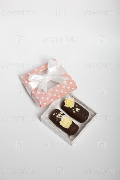 Пирожное картошка в подарочной упаковке. Украшен сливочным кремом. На белом фоне. Снято крупным планом
