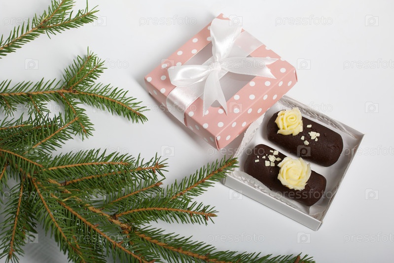 Пирожное картошка в подарочной упаковке. Украшен сливочным кремом. На белом фоне. Рядом с еловой веткой. Снято крупным планом