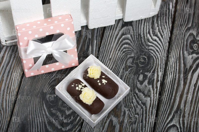 Пирожное картошка. Украшен сливочным кремом. В подарочной коробке. На фоне черных сосновых досок. Снято крупным планом