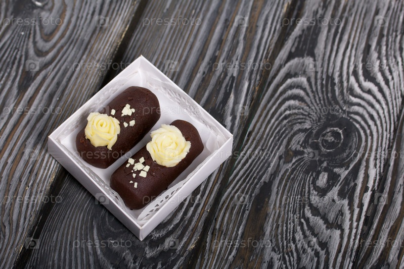 Пирожное картошка. Украшен сливочным кремом. В подарочной коробке. На фоне черных сосновых досок. Снято крупным планом