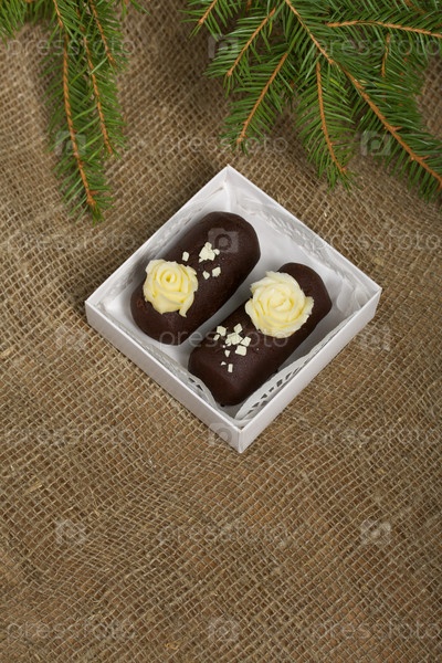 Пирожное картошка. Украшен сливочным кремом. В подарочной коробке. На льняном фоне. Рядом с еловой веткой. Снято крупным планом