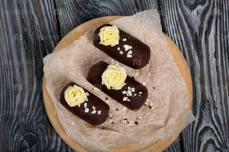Пирожное картошка. Украшен сливочным кремом. На фоне черных сосновых досок. Снято крупным планом